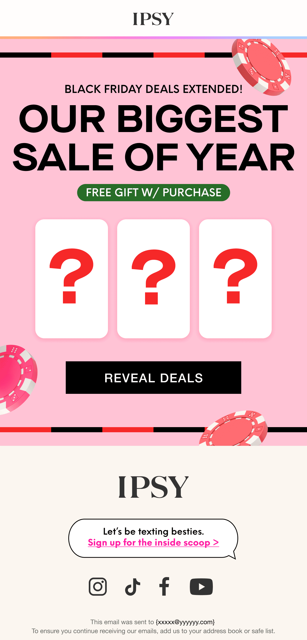 IPSY engages customers with a unified Black Friday campaign across email and SMS. Bold, high-contrast emails feature eye-catching visuals, interactive elements like spin-to-save games, and clear calls-to-action.