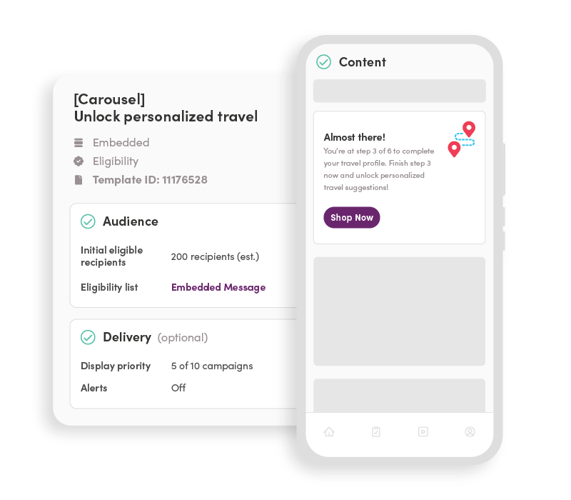 By design, Embedded Messaging content is delivered to users without interrupting their in app or on web experience. Create carousels, hero banners, and feeds, or create something completely custom – no more distractions from annoying pop-ups.