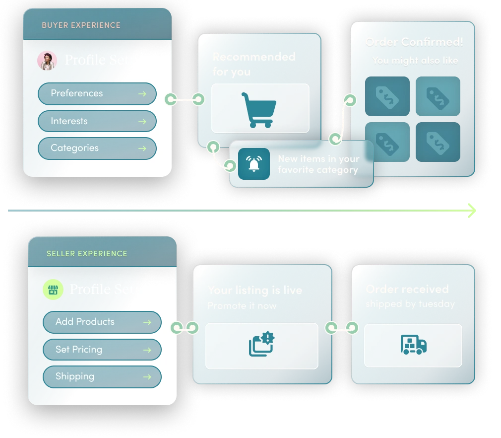 Yes. Iterable’s Studio (journey builder) allows for cross-audience orchestration. You can create a tansaction loop workflow where a buyer action (like “item purchased”) triggers a simultaneous branch for the seller (“ship your item”).